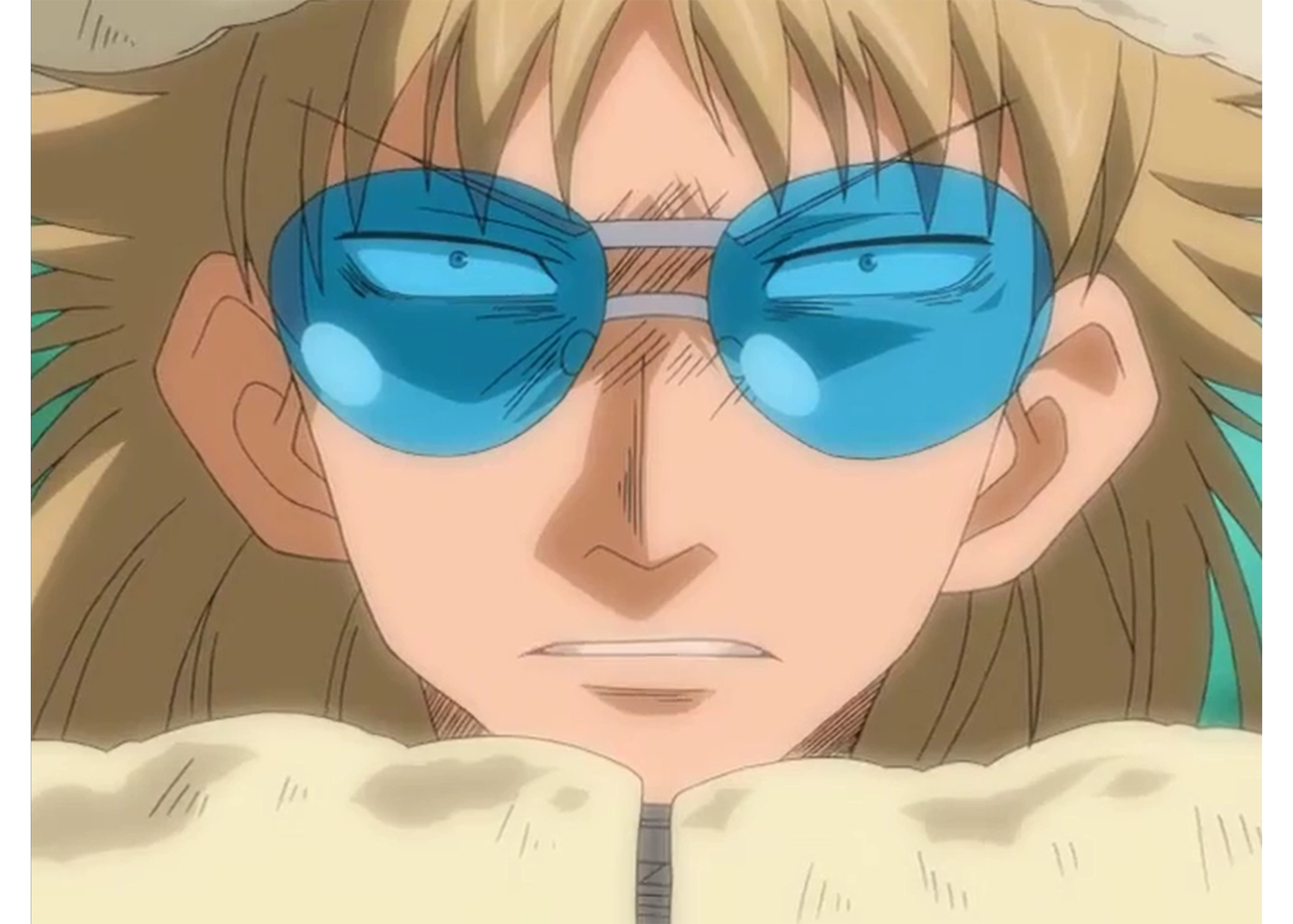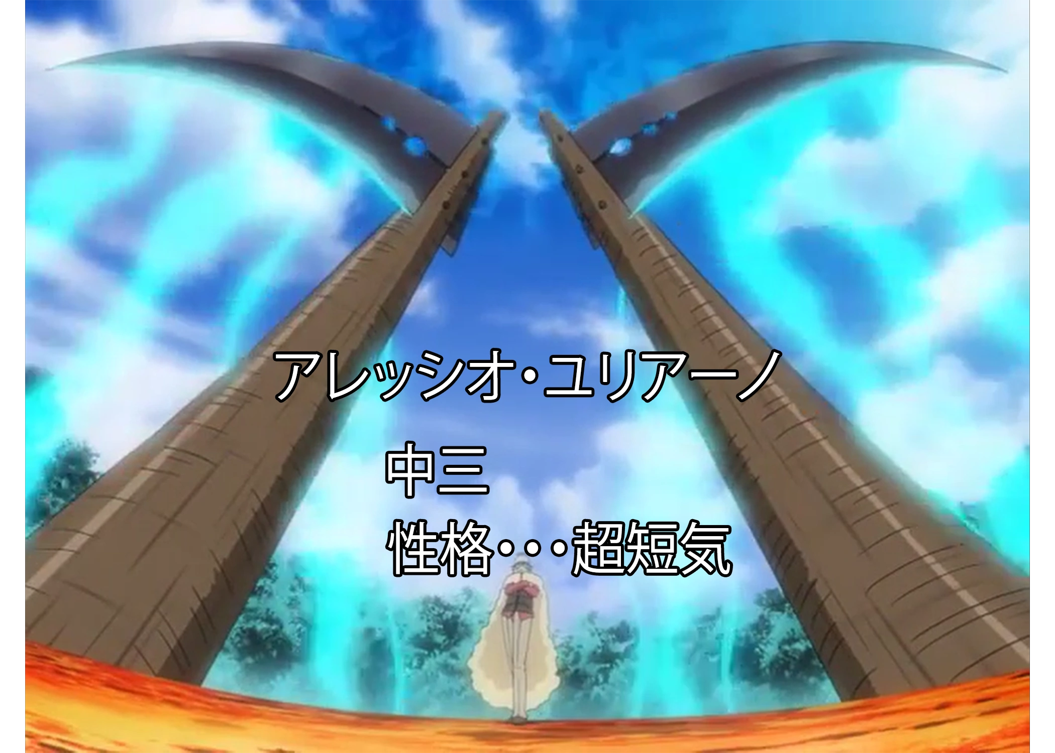Alessio Iuliano (アレッシオ・ユリアーノ, Aresshio Yuriāno) is one of the members of Robert's Ten. He is very loyal to Robert and will not stand for just anyone to join the group. His power is to turn dirt into scythes. He is a very short-tempered individual whom Ueki cannot help but irritate. Upon realizing his heavenly powers, Ueki puts him down for the count with Kurogane. Alessio was shown wearing a pair of blue glasses, and a wool hat, in the anime, and was considered by Robert himself to be one of the weakest members of the 10.