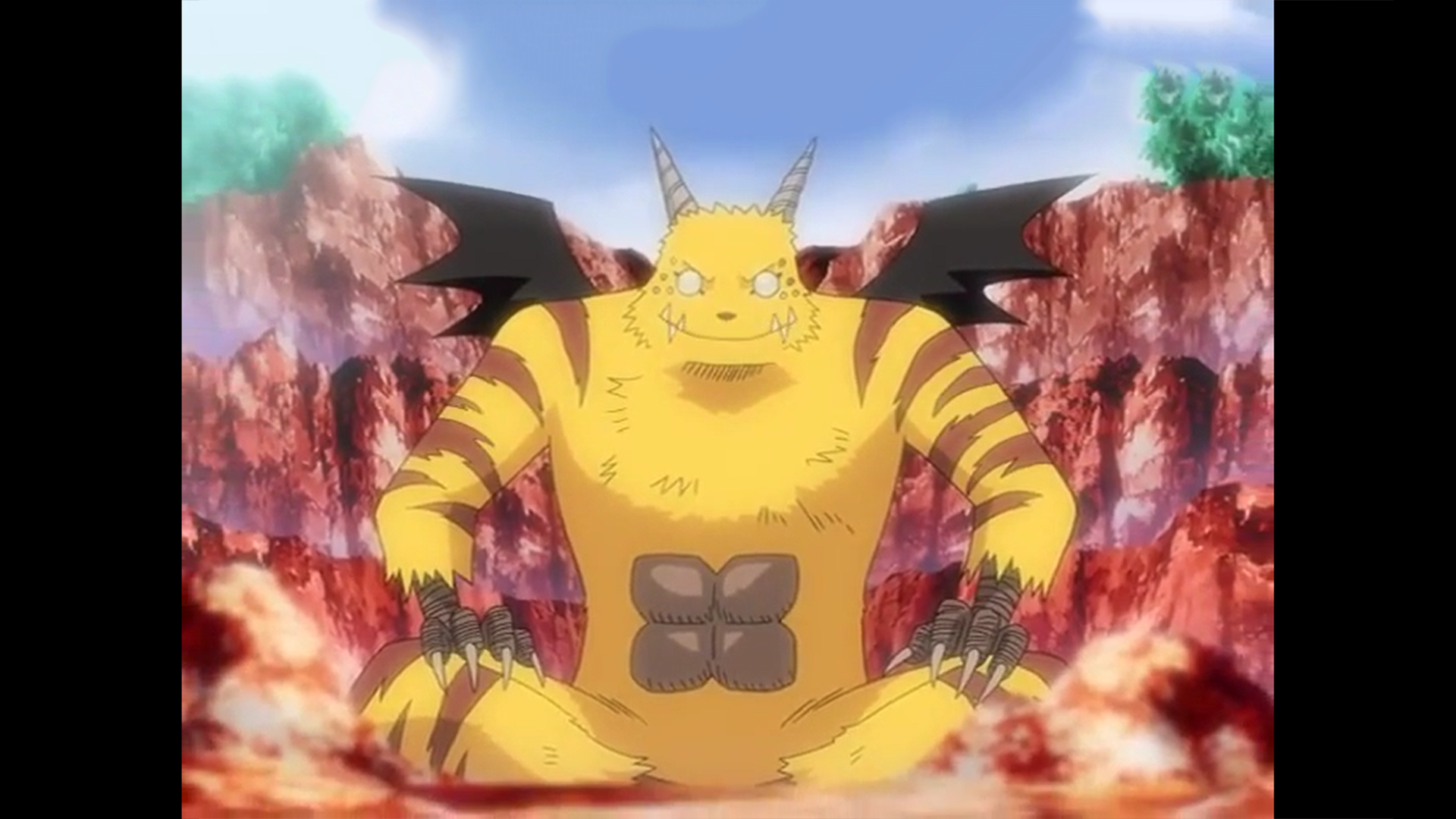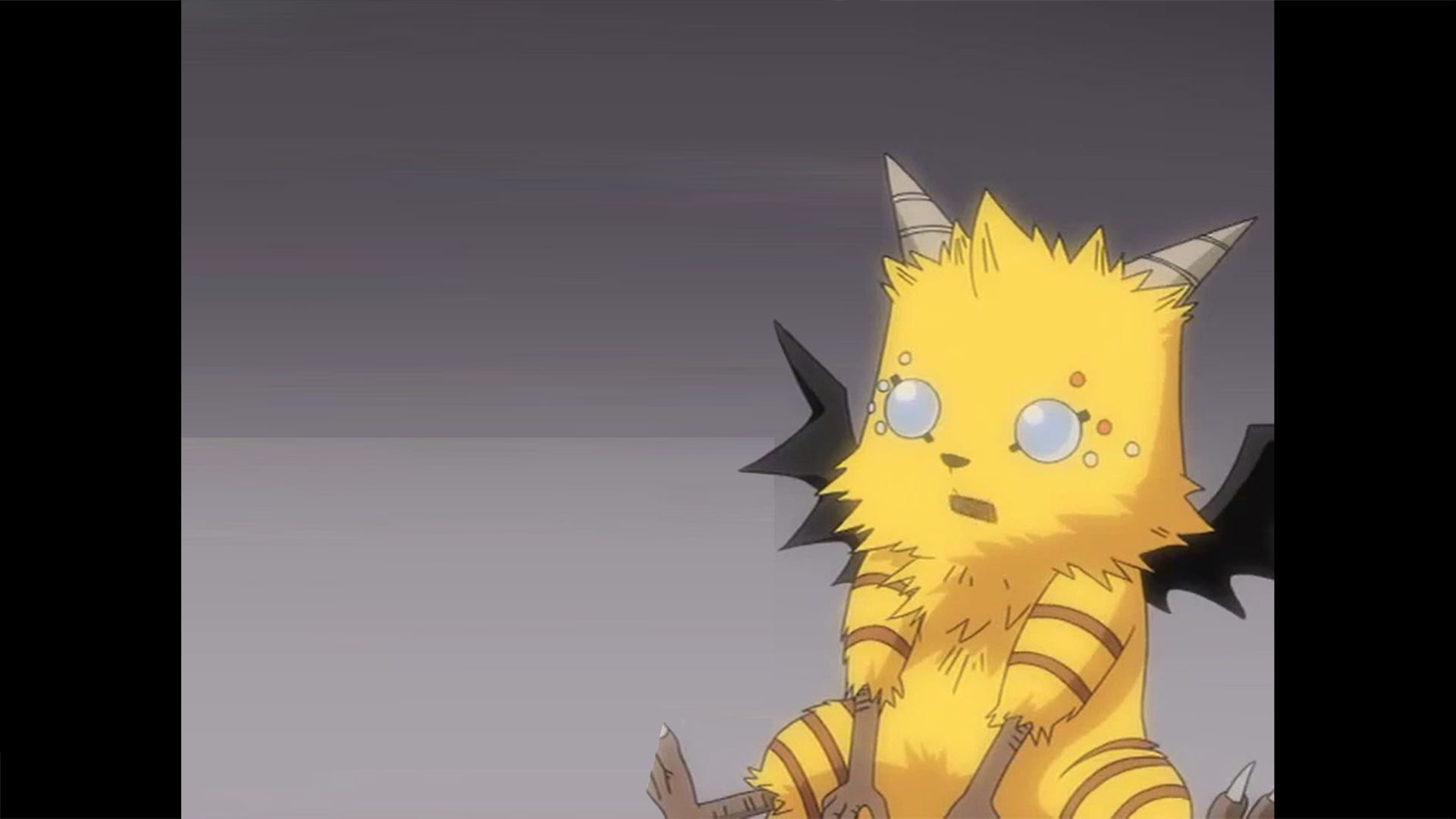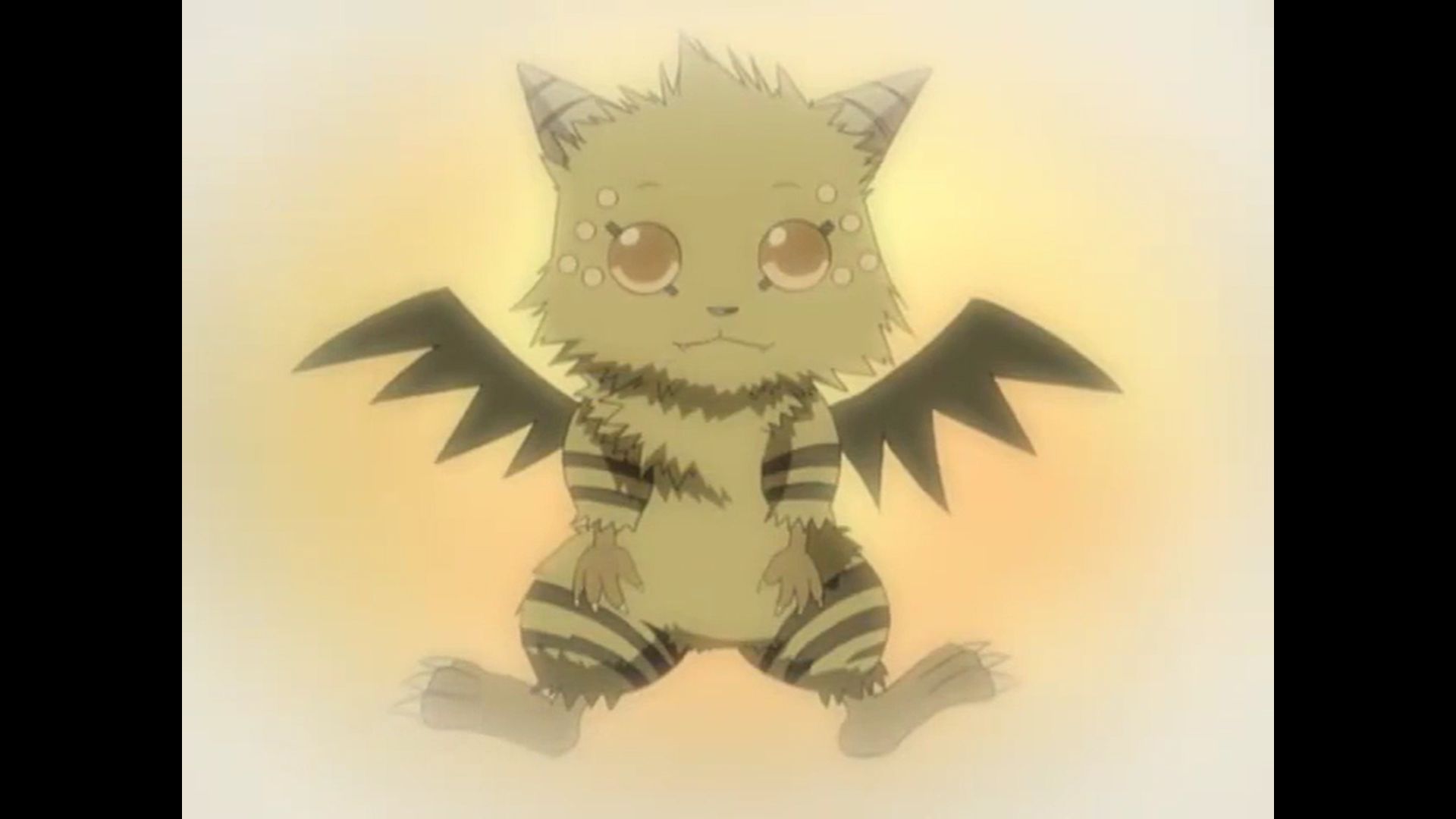 Tenko (テンコ) is a Celestial Beast that lives together with Celestial/Heavenly Being in Celestial World. He is a large tailless yellow furred fox-like Heavenly Beast with duiker horns on his head, ten half blue and half red beady eyes (with the main blue pair three to six times larger than the other pairs), black bat-like wings, brown stripes on his limbs and with no visible ears.