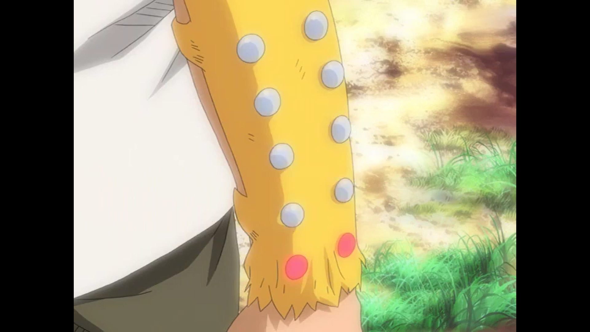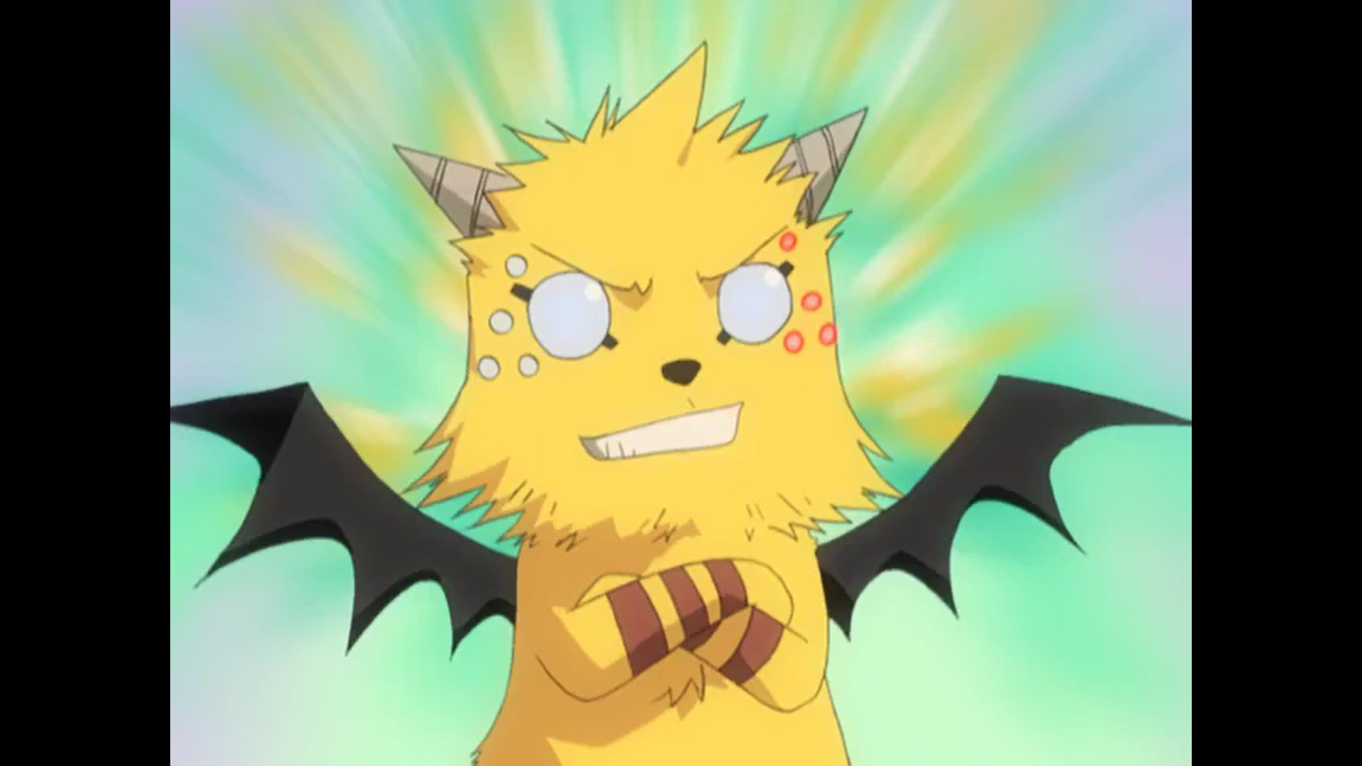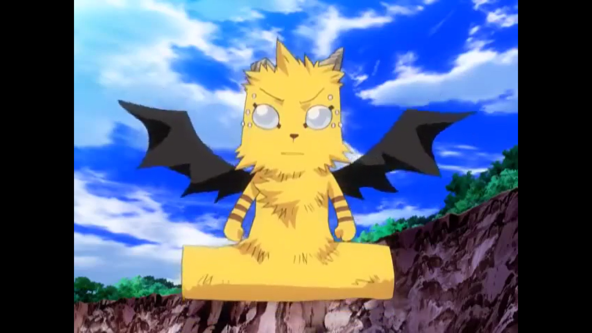 He can also change his shape to fit onto Ueki's wrist like an arm protector used by goaltenders in ice hockey to give him advice, and able to communicate with Ueki telepathically in this form. He has a mutation among his kind, he can't stop growing like an ancient version of Heavenly Beast, which is a ferocious-looking Godzilla-sized fox-like creature instead of an adorable cat-sized genetically-engineered house pet.